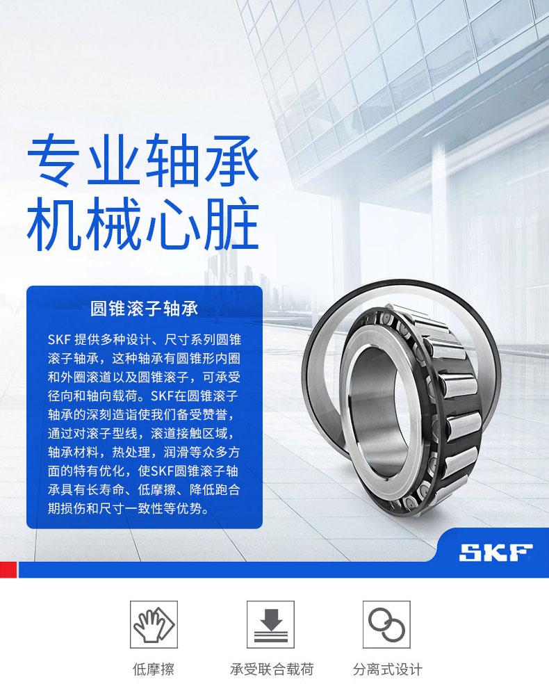 SKF圓錐滾子軸承,可以分離,由內(nèi)圈與滾子、保持架一起組成的組件和外圈可以分別安裝。
