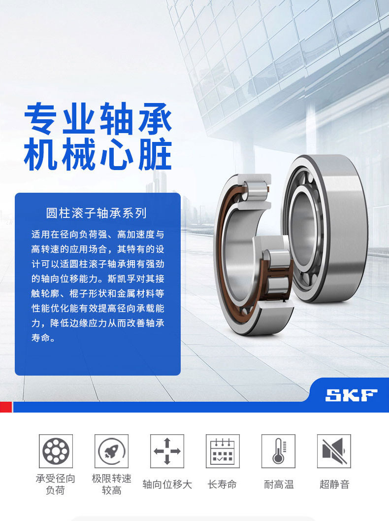 圓柱滾子與滾道為線接觸軸承。負荷能力大,主要承受徑向負荷。滾動體與套圈擋邊摩擦小,適于高速旋轉。根據套圈有無擋邊,可以分有NU、NJ、NUP、N、NF等單列圓柱滾子軸承,及NNU、NN等雙列圓柱滾子軸承。該軸承是內圈、外圈可分離的結構。